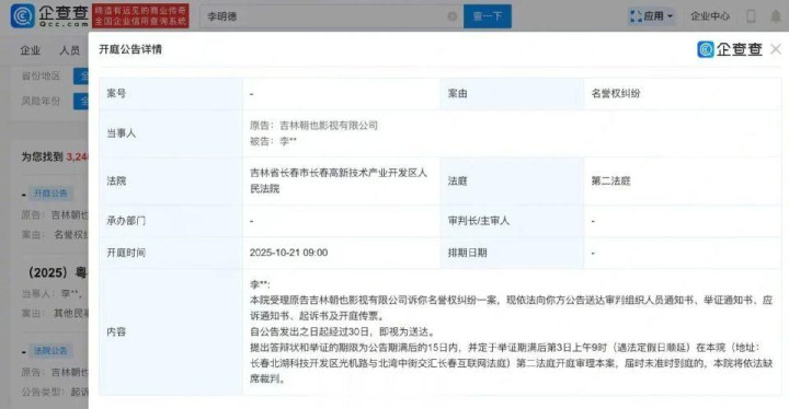 企查查APP显示,9月3日,法院公开吉林省朝也影视有限公司与李明德名誉权纠纷开庭信息,李明德为被告,计划将于2025年10月21日在吉林省长春市长春高新技术产业开发区人民法院开庭。