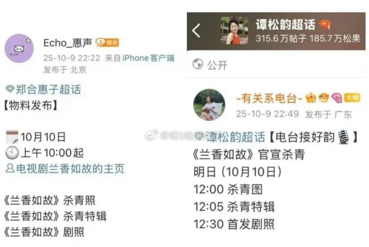 不过,《兰香如故》剧组9日公布隔日发布杀青特辑消息,身为女三的郑合惠子,她的后援会却在9日晚上10点22分,公布10日会释出杀青特辑,而谭松韵的后援会,则是在9日晚上10点49分才宣布,显见郑合惠子方面故意抢先谭松韵发布,完全触犯业界规矩,所以让谭松韵粉丝非常不满。