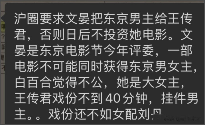 白百何发文风波持续发酵,有网友爆料是因为沪圈为王传君撕下东京电影节影帝,白百何这个《春树》中戏份最多的女主反倒颗粒无收,惹得她多次发文内涵,也引起网友争议。