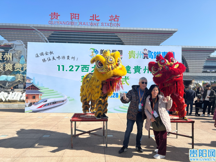 在贵阳北站西广场举行的欢迎仪式上,一阵阵芦笙声和灵动的舞狮表演点燃现场气氛。身着盛装的苗族姑娘笑意盈盈地为香港游客挂上寓意祝福的红鸡蛋,这份质朴又特别的问候让游客倍感温暖。“一到贵阳就感受到满满的热情,不仅准备了民族特色欢迎仪式,还有精彩的表演,让我一下就爱上了这里!”香港游客李云龙为这份专属礼遇点赞。
