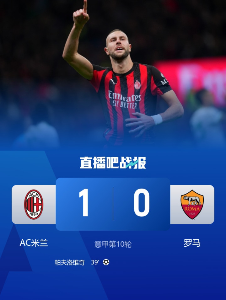 本轮意甲焦点战,米兰1-0击败罗马,莱奥助攻帕夫洛维奇打入全场唯一进球。