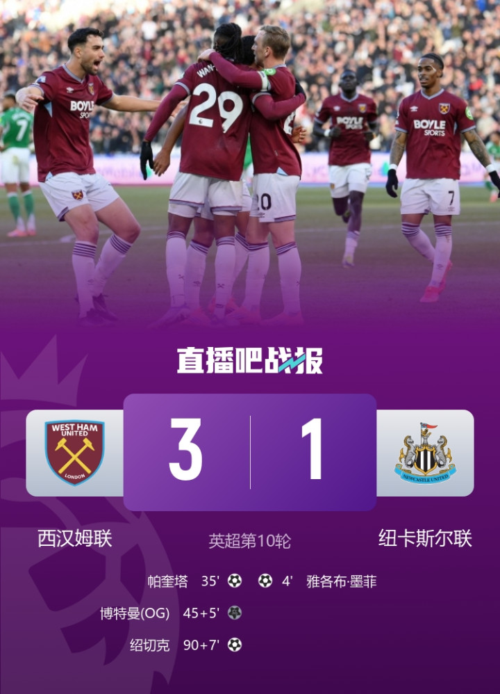 英超-西汉姆联3-1纽卡结束6轮不胜帕奎塔世界波万比萨卡造乌龙