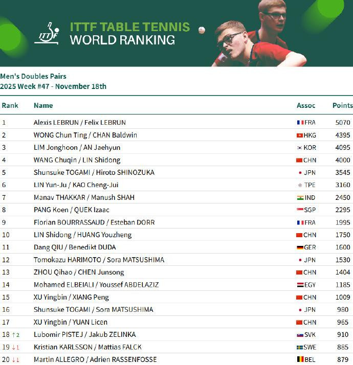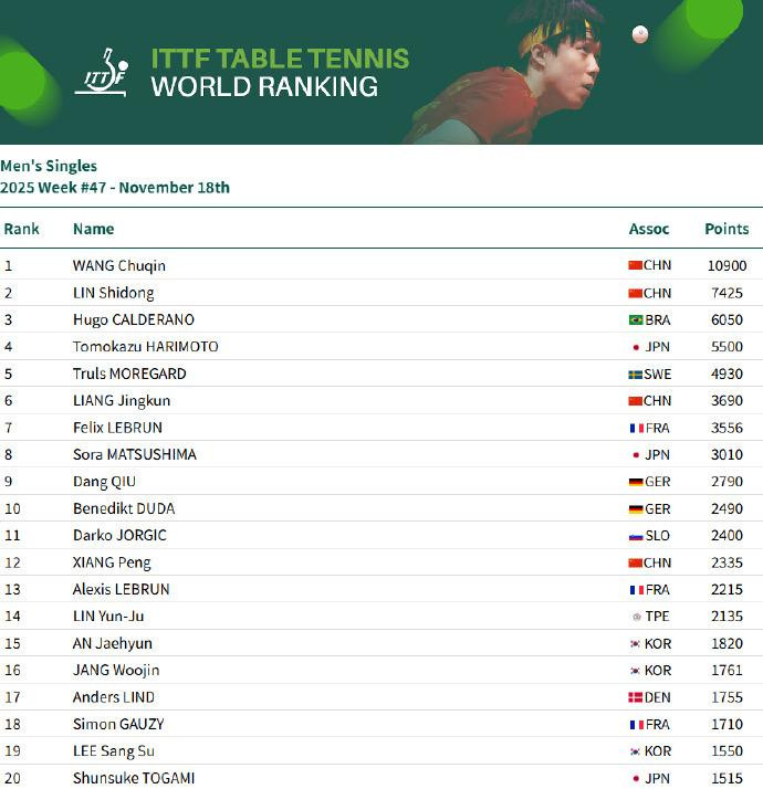 男单:王楚钦10900分、林诗栋位列前二,梁靖崑位列第6,向鹏第12