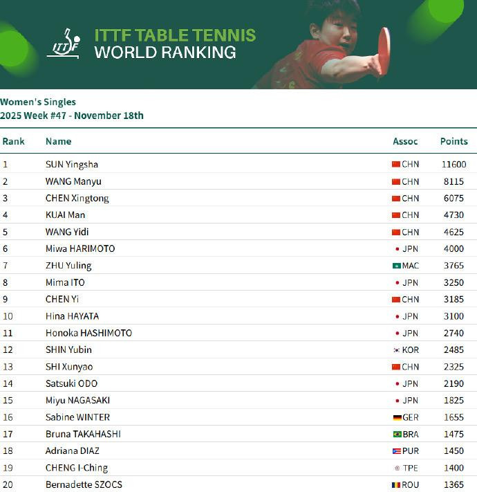 国际乒联第47周世界排名: 孙颖莎连续第175周霸榜世一