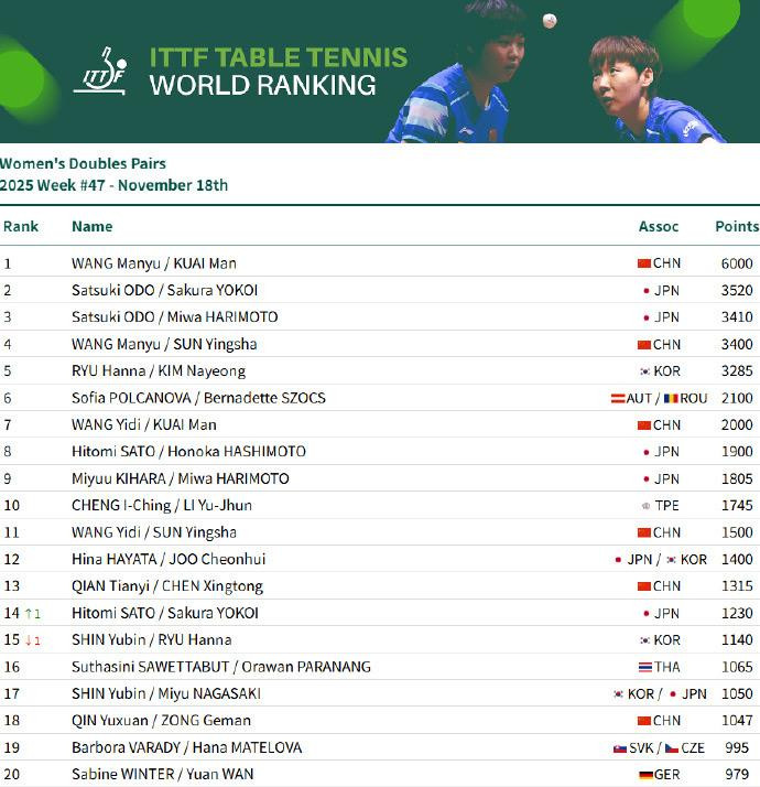 虎扑11月18日讯国际乒联发布第47周世界排名,孙颖莎以11600分稳居第一,这也是她连续第175周霸榜世一。排名主要如下:
