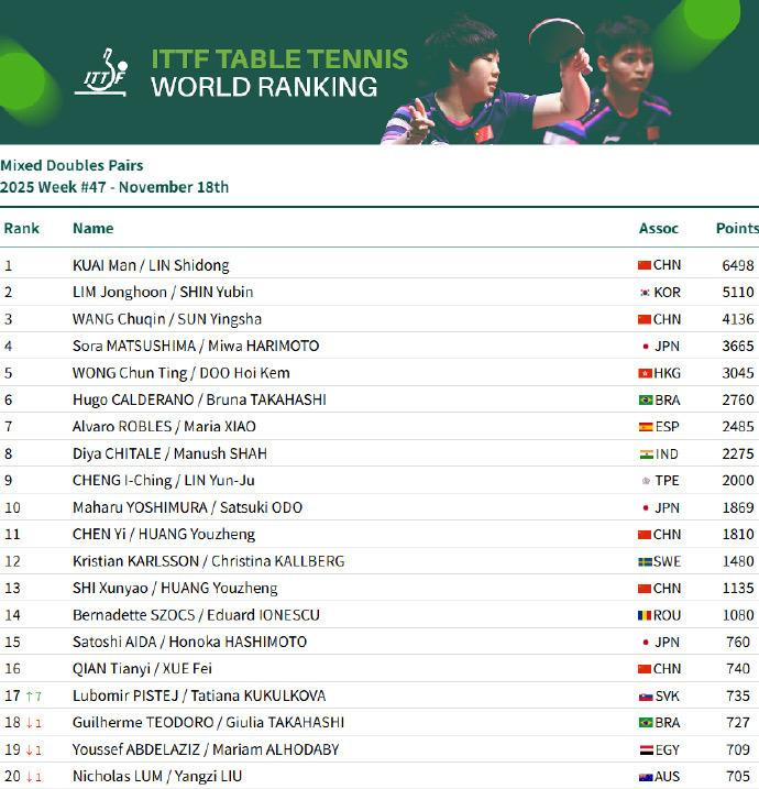 混双:林诗栋/蒯曼第1、王楚钦/孙颖莎第3、黄友政/陈熠第11