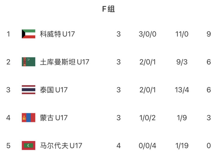 而在F组中,科威特9分,土库曼斯坦、泰国均为6分分列第2、3名,3队争夺小组第1。最后一轮中科威特对阵泰国,科威特还差1分就出线。泰国即便战胜了科威特也有可能被淘汰,因为他们上轮输给了另一个竞争对手土库曼斯坦,收官战中土库曼斯坦对已经出局的蒙古。泰国队现在很被动,晋级希望渺茫。